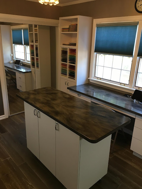 The counter on the left rolls to the middle of the room so I can use the entire area and walk around it. It also will enable me to have a few friends in my craft studio where everything is at hand.